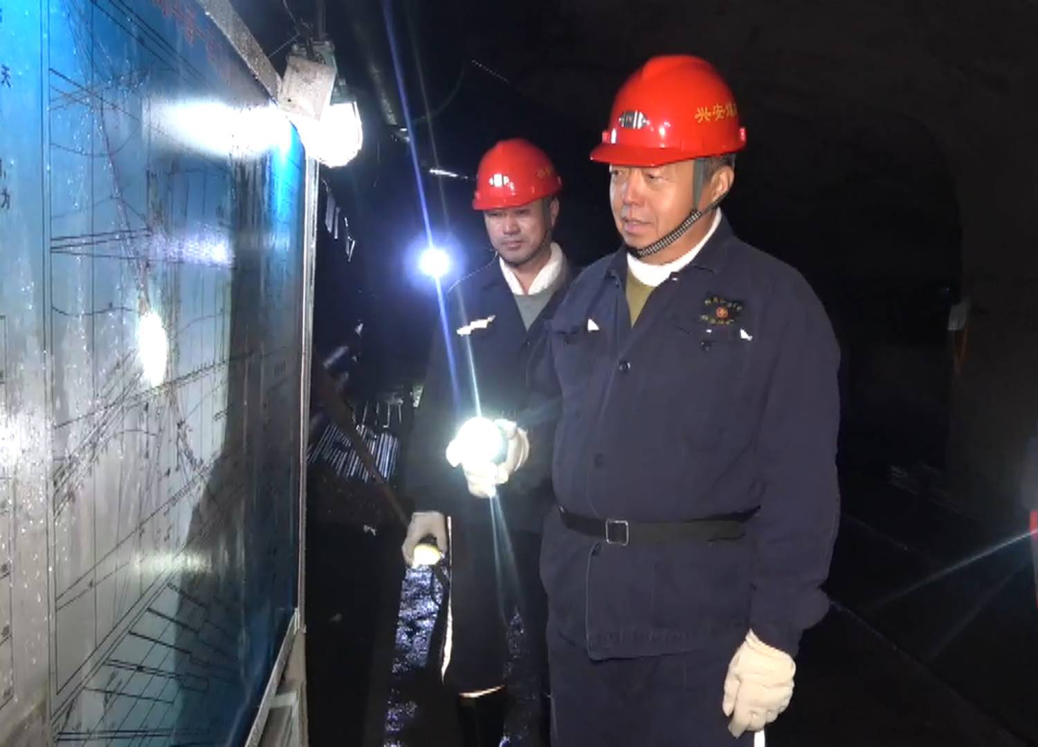 在515開(kāi)拓隊(duì)施工現(xiàn)場(chǎng),韓福生對(duì)照技術(shù)牌板詢(xún)問(wèn)了巷道的用途、總工程量和剩余工程量。當(dāng)?shù)弥@個(gè)隊(duì)的技術(shù)員宋宜倫是新入職的大學(xué)生后,韓福生勉勵(lì)他要熱愛(ài)職業(yè),珍惜崗位,扎根礦山,努力工作。